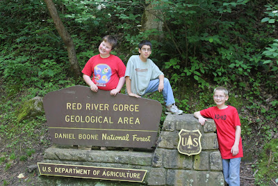 Went to Red River Gorge today with Rachel and Walker. Had a GREAT time!!! We stopped by the rest stop at Slade and explored the red caboose. It was open today and we got to go inside. WE drove past through the Nada tunnel and along highway 77 into the gorge area. It was beautiful. We rolled down the windows and I felt the stress melt away. We were remarking about it and Jacob said, "nature power." Nature truely does have a wonderful relaxing power for me. We stopped at a log cabin with picnic tables for lunch, then we drove on down to the Gladie Learning Center and the boys all worked on the Learning Page and they gave them Smokey the Bear pins :) We hiked the Whistle Arch trail and spent some time climbing on rocks. After the hiking we stopped by the pool at Natural Bridge. We left at 10 am and didn't get home until 6!! Anthony didn't want to get out of bed to go with us. He ended up going to the library for a teen craft program, although I think he really went to see a girl ;)